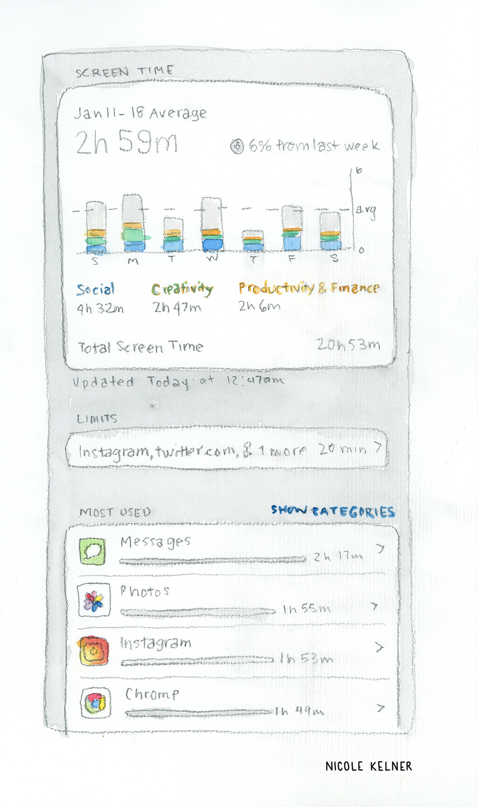 This comment stuck with me. It does feel like my screen time is a self-portrait of my week. This little snapshot reminds me of where my time and attention went. And drawing it out makes me reflect and set intentions for the next week.