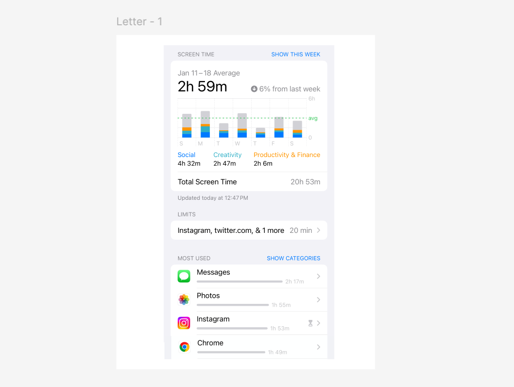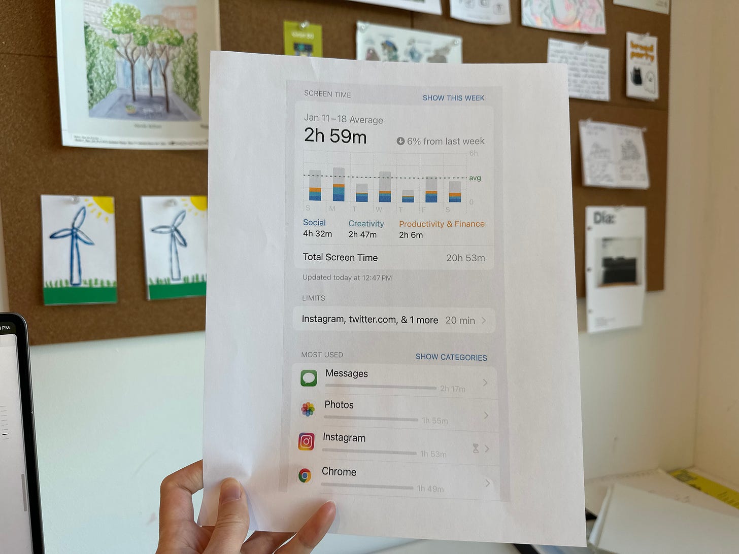 Go to Settings and then scroll down to “Screen Time” in your iPhone. You can then print out that photo. I put mine in Figma to turn it into a PDF with the sizing I wanted.