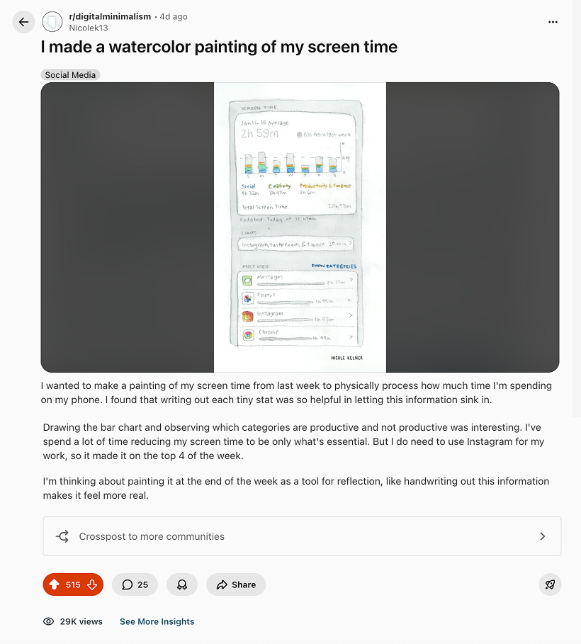 I posted the painting on Reddit, and it reached the top of the Digital Minimalism subreddit, with 30K views in the past 4 days.