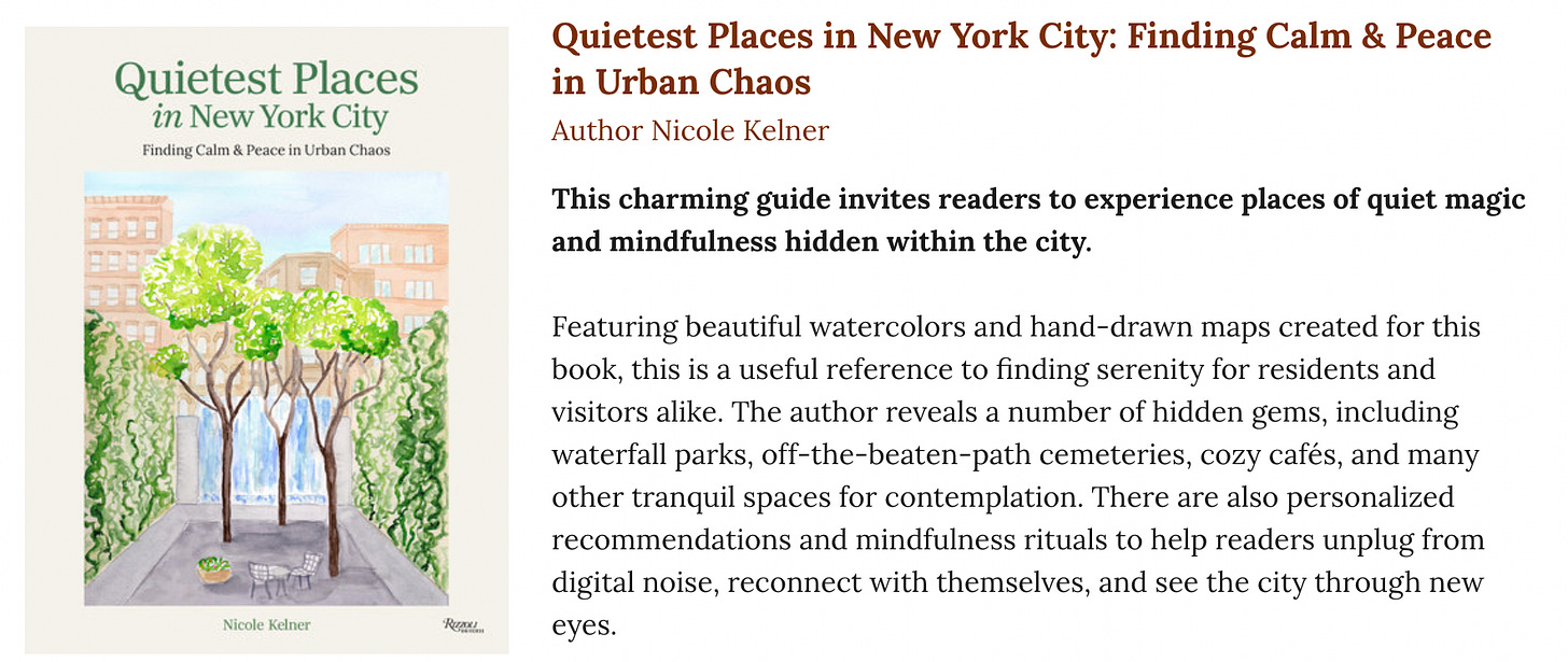 This book began right here, as a Substack post to you all, called Quietest Places in NYC. That post was forwarded to an editor at Rizzoli, who reached out and asked if I wanted to turn it into a book.