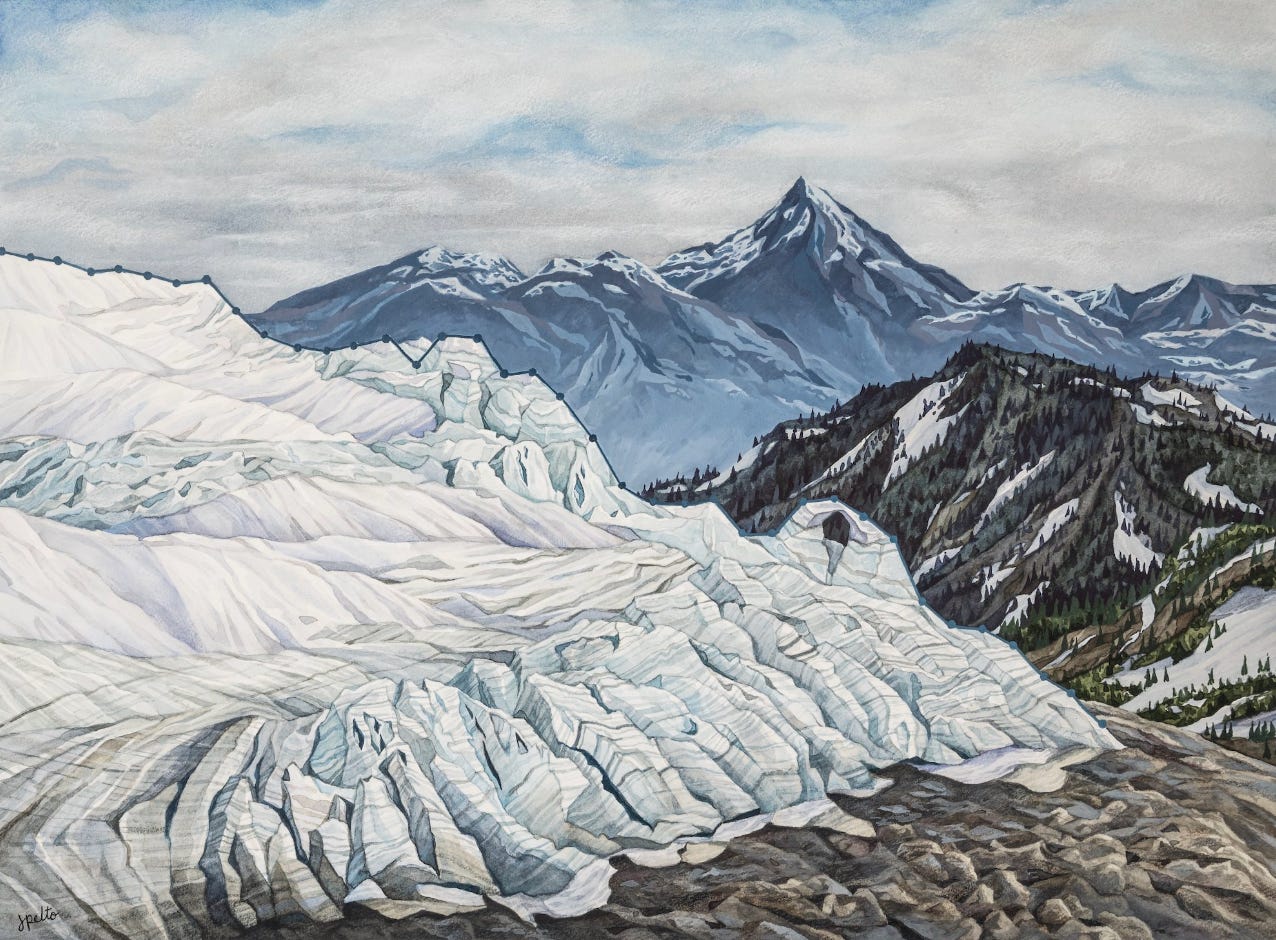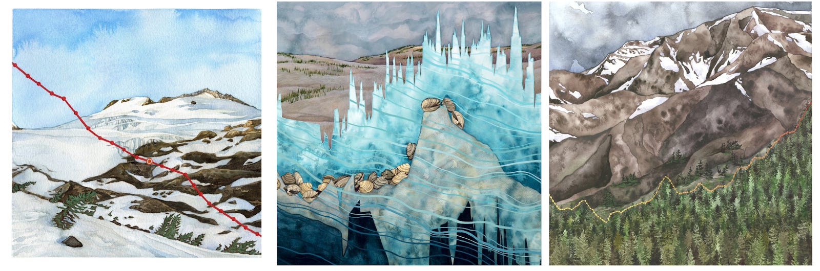 In the painting below, the top surface of the mountain glacier is a line graph that depicts the mass balance of North Cascade glaciers in Washington state from 1984-2022. Mass balance is the health of a glacier: the difference in snowfall gain vs. melt each year. View more of her work here.