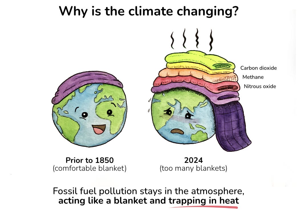 Alaina Coppa is a User Experience Designer for Citizens' Climate Lobby and has been creating gorgeous watercolors about climate in my Climate Art 101 course. She created a piece that beautifully visualizes the common metaphor we hear in climate about the atmosphere being like a blanket for the earth.
