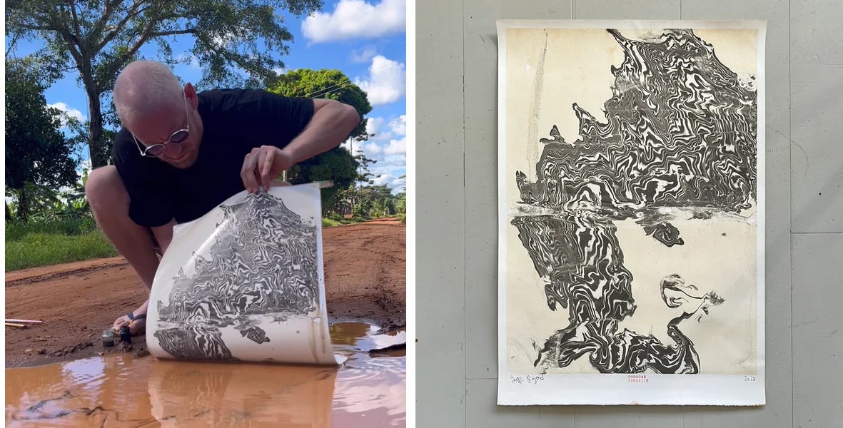He then lays paper on the water’s surface to absorb the designs. Each piece, marked with the coordinates of where it was made, is a “testament to the potential for beauty to emerge from even the most unpredictable circumstances,” says Ringsted.